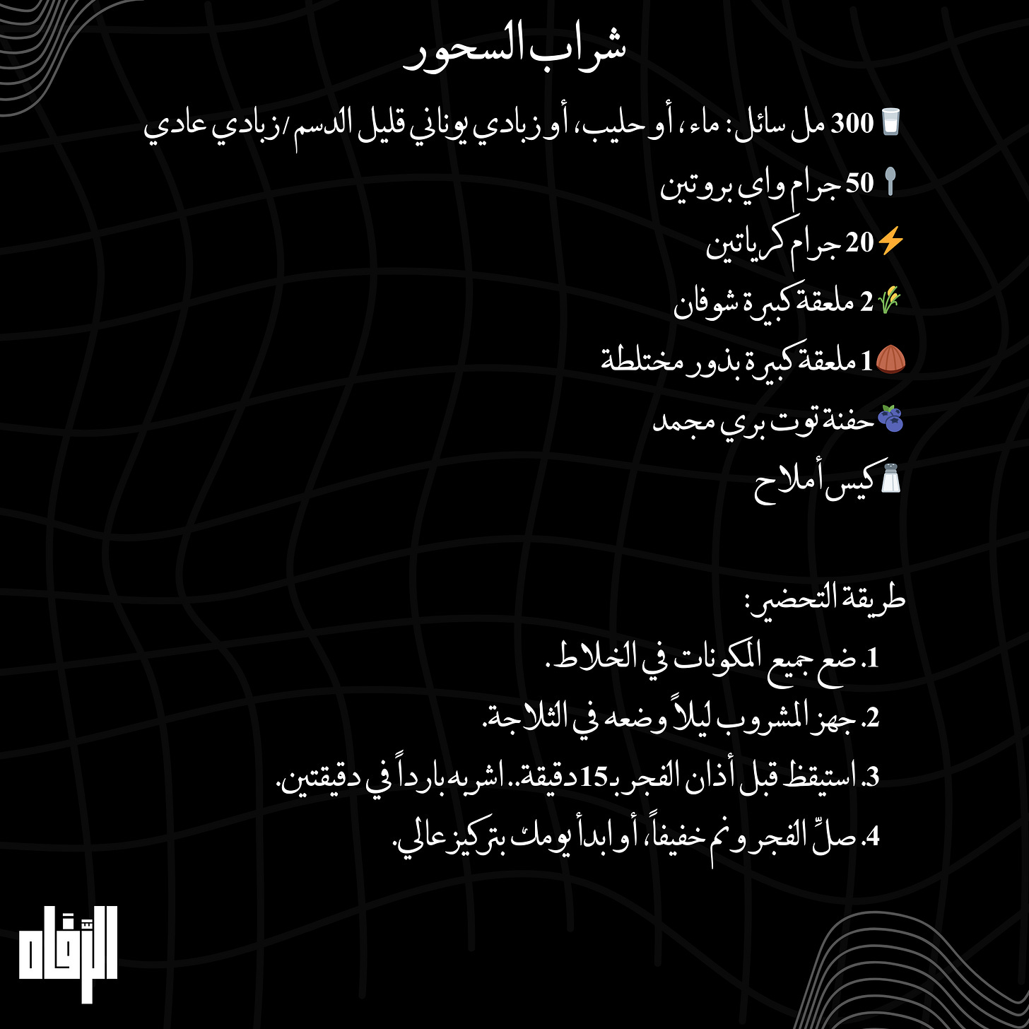 فيما يخص وصفة السحور: أضفت التعديل اللازم للوصفة لتشمل القاعدة السائلة (الزبادي اليوناني قليل الدسم، الحليب أو الماء)، حيث سقطت سهواً في المسودة السابقة. المشروب جاهز الآن ليكون وقودك لهذا الشهر.